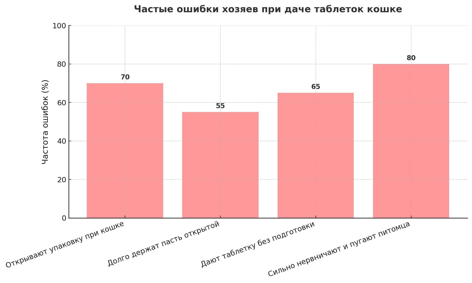Есть ещё один тонкий момент: не открывайте упаковку с таблеткой при животном. Кошки моментально реагируют на непривычные запахи. Услышав шуршание блистера или почувствовав аромат лекарства, они начнут настораживаться ещё до того, как вы приблизитесь. Лучше подготовить всё заранее в другой комнате и вернуться уже с готовой дозой.