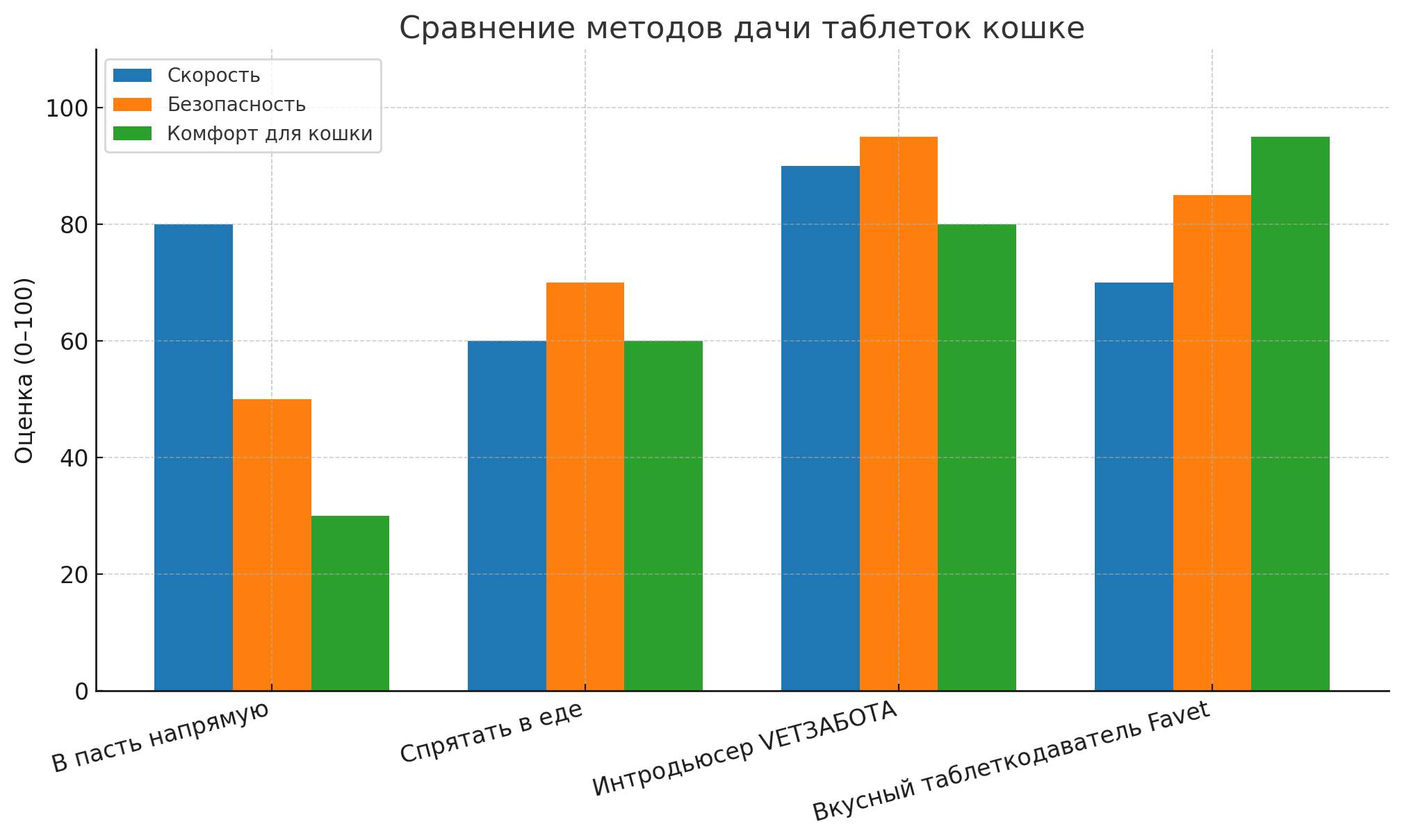 Оба варианта решают одну и ту же задачу: помогают дать коту лекарство без проблем и лишнего стресса. Интродьюсер делает процесс быстрым и контролируемым, а мягкое лакомство превращает его в игру. И в том, и в другом случае хозяин получает уверенность, что таблетка действительно проглочена, а кошка не травмирована и не обижена.