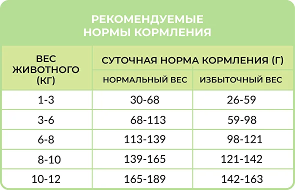 Рекомендуемое количество корма является ориентировочным и зависит от времени года, физической активности и индивидуальных особенностей животного.